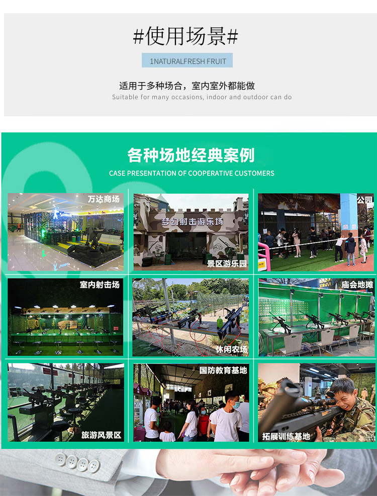 深圳军博现有产品适合在旅游景点、影视基地、游乐场、主题公园、商场、广场、特色旅游度假村、国防教育基地、射击俱乐部等场地建立集军事体验、国防教育和体育竞技为一体的军事射击主题乐园。