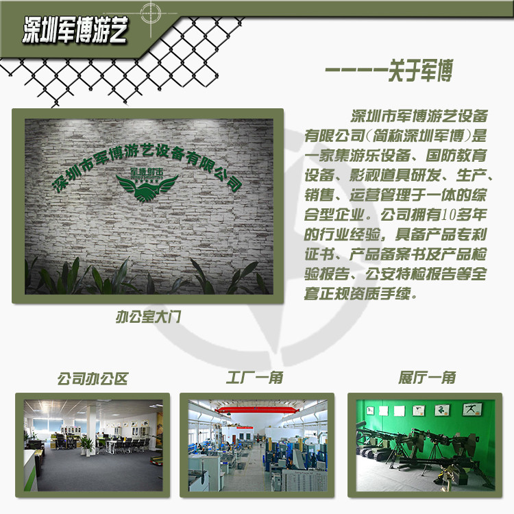 深圳市军博游艺设备有限公司创立于2016年,坐落于中国特色社会主义先行示范区深圳,是一家集设计研发、生产制造、销售服务为一体的军事主题乐园游乐设备的公司,公司拥有10多年的行业经验,具备产品备案书及产品检验报告等全套正规资质手续。专业生产制造游乐气炮枪、射箭项目、游乐坦克车等游乐设备的企业。公司始终坚持以市场为导向,以满足客户的需求为已任,生产的系列产品有气炮枪、中型气炮、大炮、目标靶牌、炮台、射箭、游乐坦克车等100多种产品,被广泛应用于商场、景区、农庄、大型公园、游乐场、生态园、拓展研学基地、主题公园等场所,深受国内客户好评!